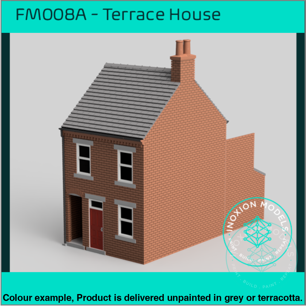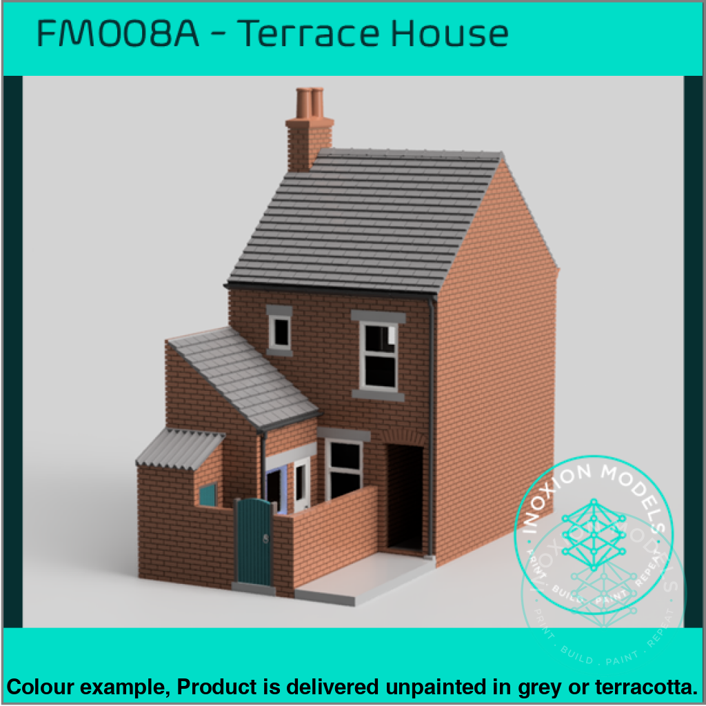 This kit is of a typical basic terrace house, of a style found in many towns and cities accross the UK. This version features three sash windows on the front, a one storey anex and a back yard with a outdoor toilet/tool shed. There is a passageway built through this building to allow occupants access to the back yards.