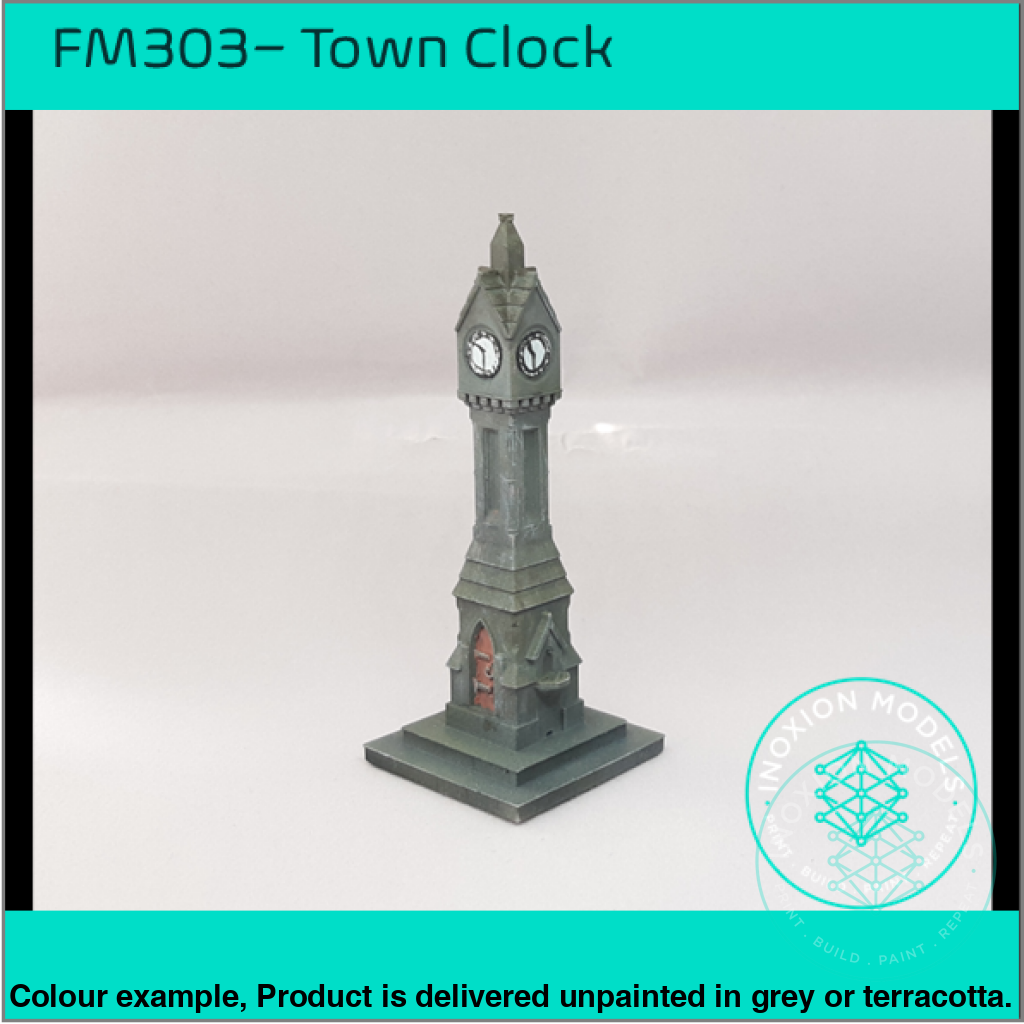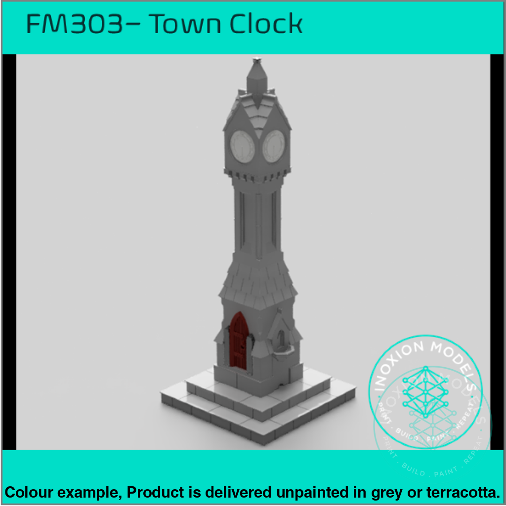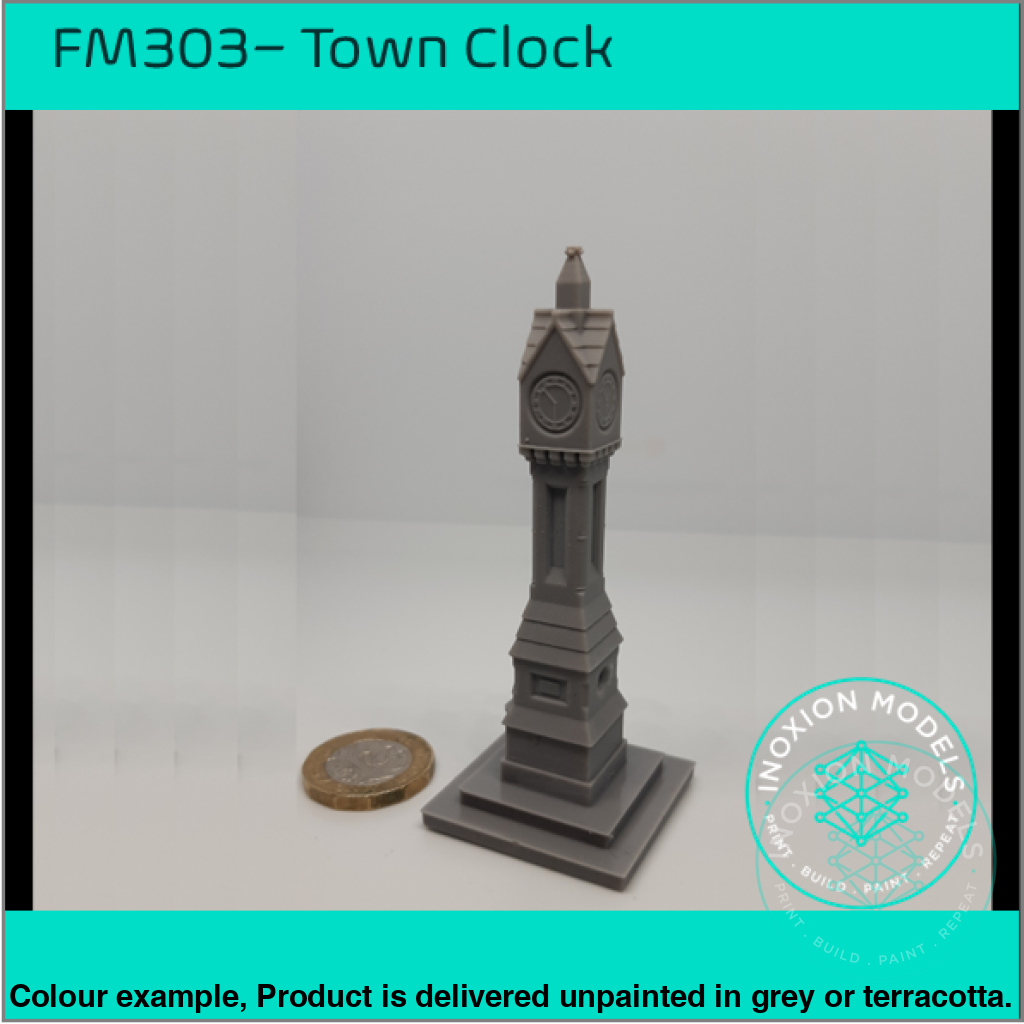 The Models depicts a town clock, of a kind usually found in the square at the centre of a Market Town. The clock is atop a decorated stone tower, with a fountain and access door at the base.