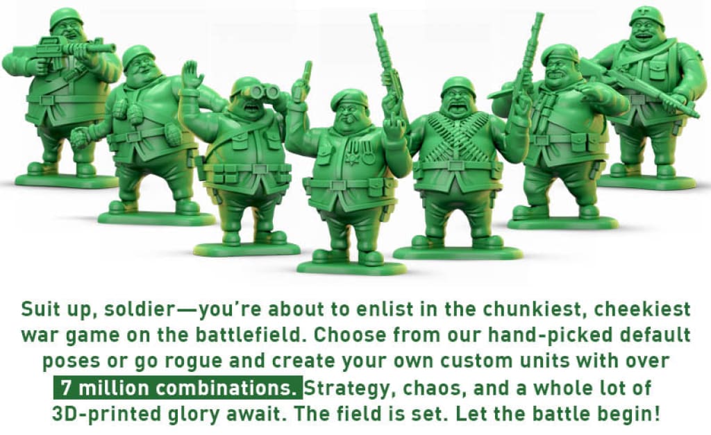 The Fat Soldier Collection Figures offer a modular design with countless combinations of arms, heads, and bodies, perfect for creating unique toy soldiers. Ideal for wargaming enthusiasts, this figure brings versatility and fun to your collection, allowing you to build millions of distinctive poses and scenarios.